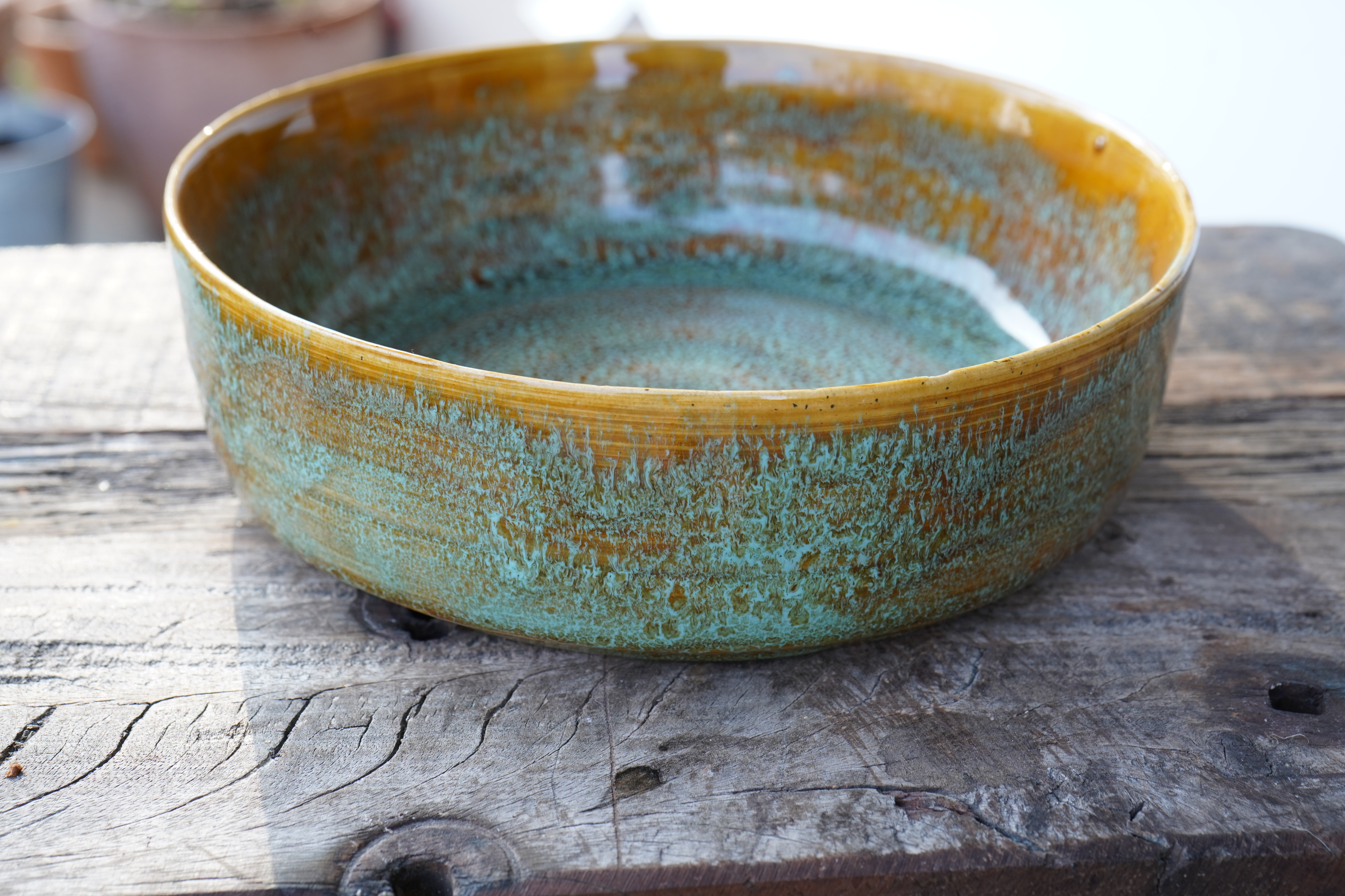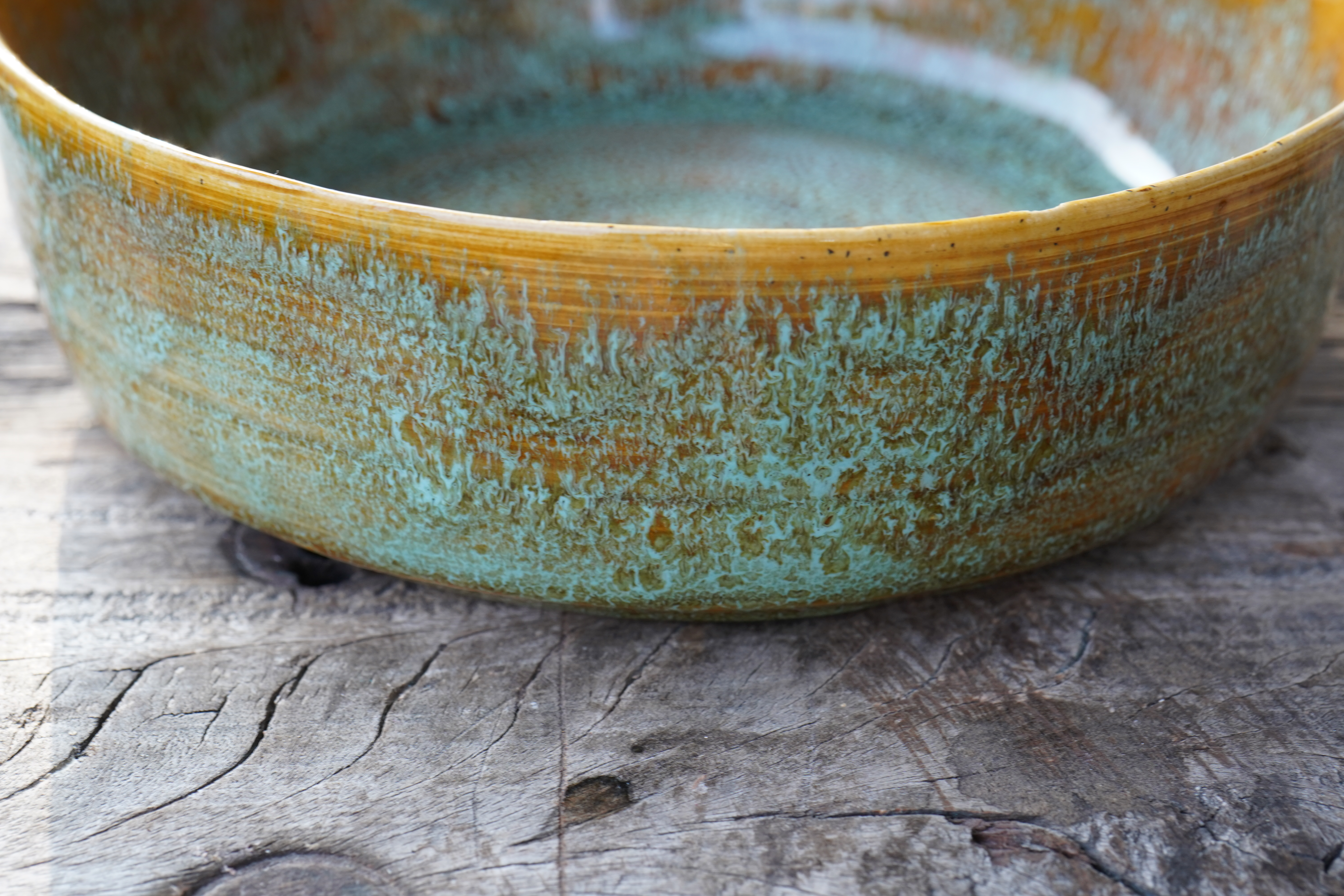 Sehr schöne handgetöpferte bronze türkisene Bowl/tiefer Teller für Suppe, Pasta oder was das Herz begehrt. Ebenso kann diese schöne besondere Schale auch als Obstschale oder für Kekse, etc verwendet werden und sieht als Deko auf einem Holztisch besonders schön aus