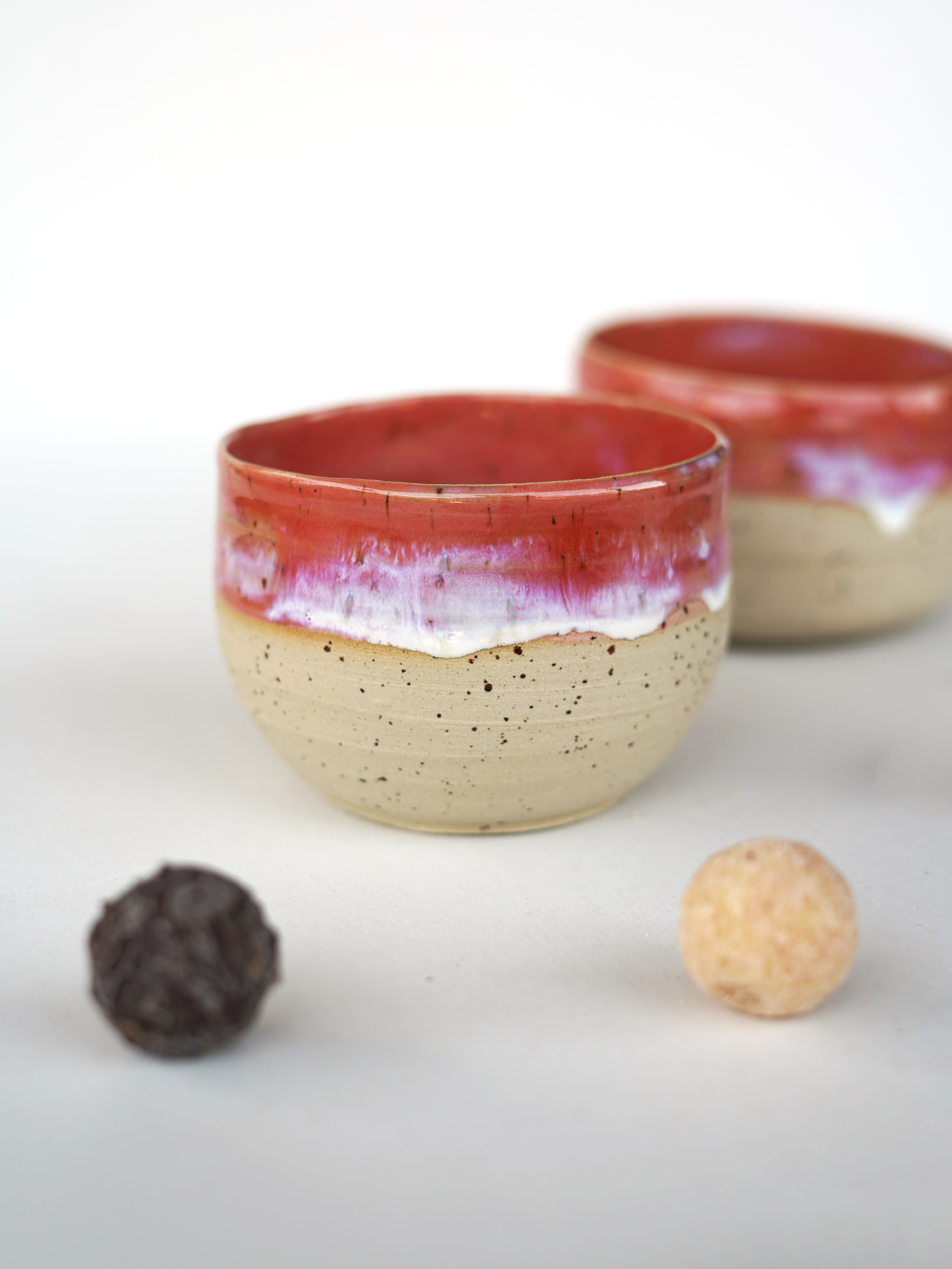 Handgetöpferte Tasse mit Himbeerrot und Creme – jedes Stück ein Unikat