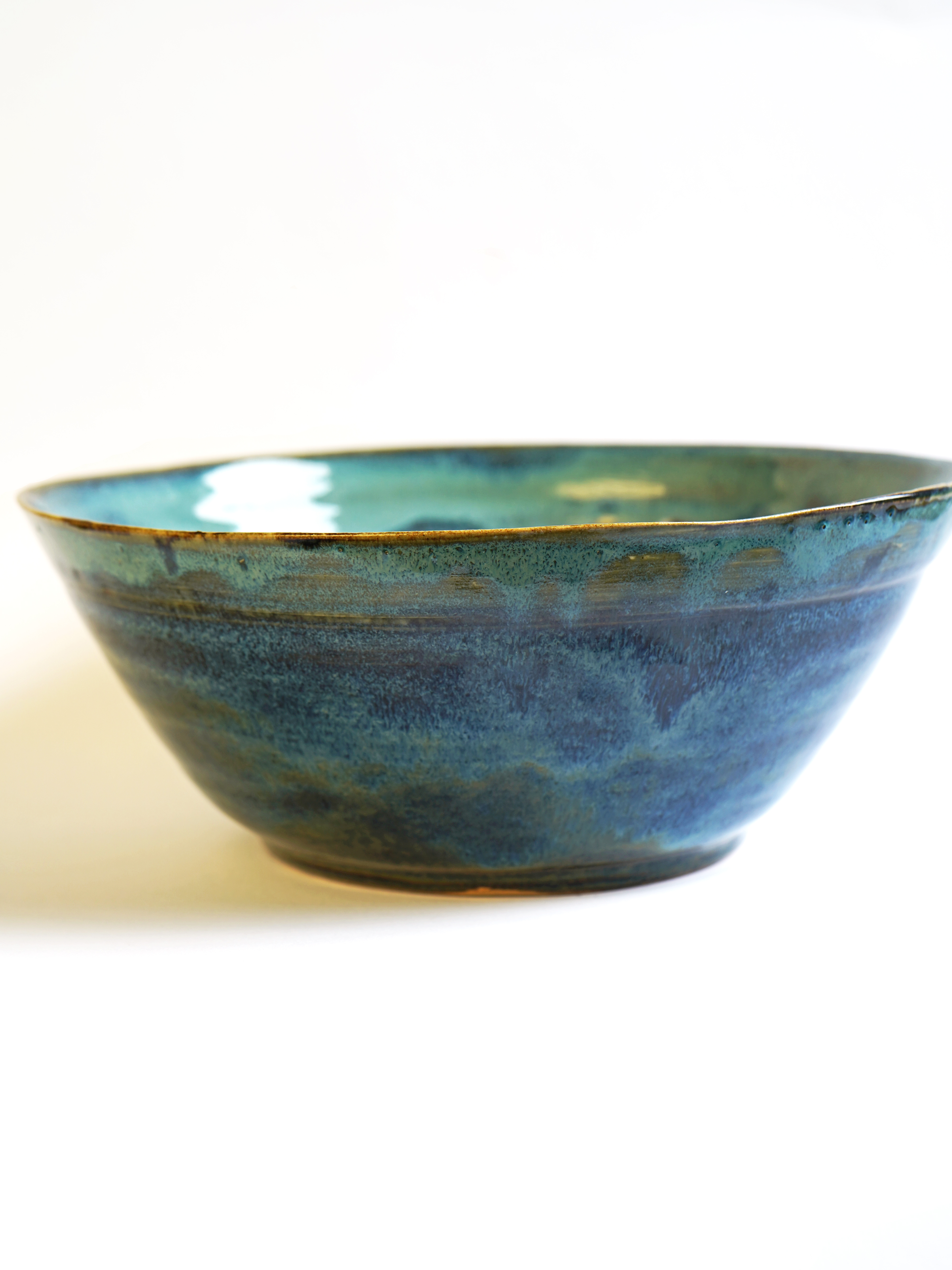 handgetöpferte Obst Bowl Keramikschale in schimmerndem Grünblau mit vielen Farbnuancen.