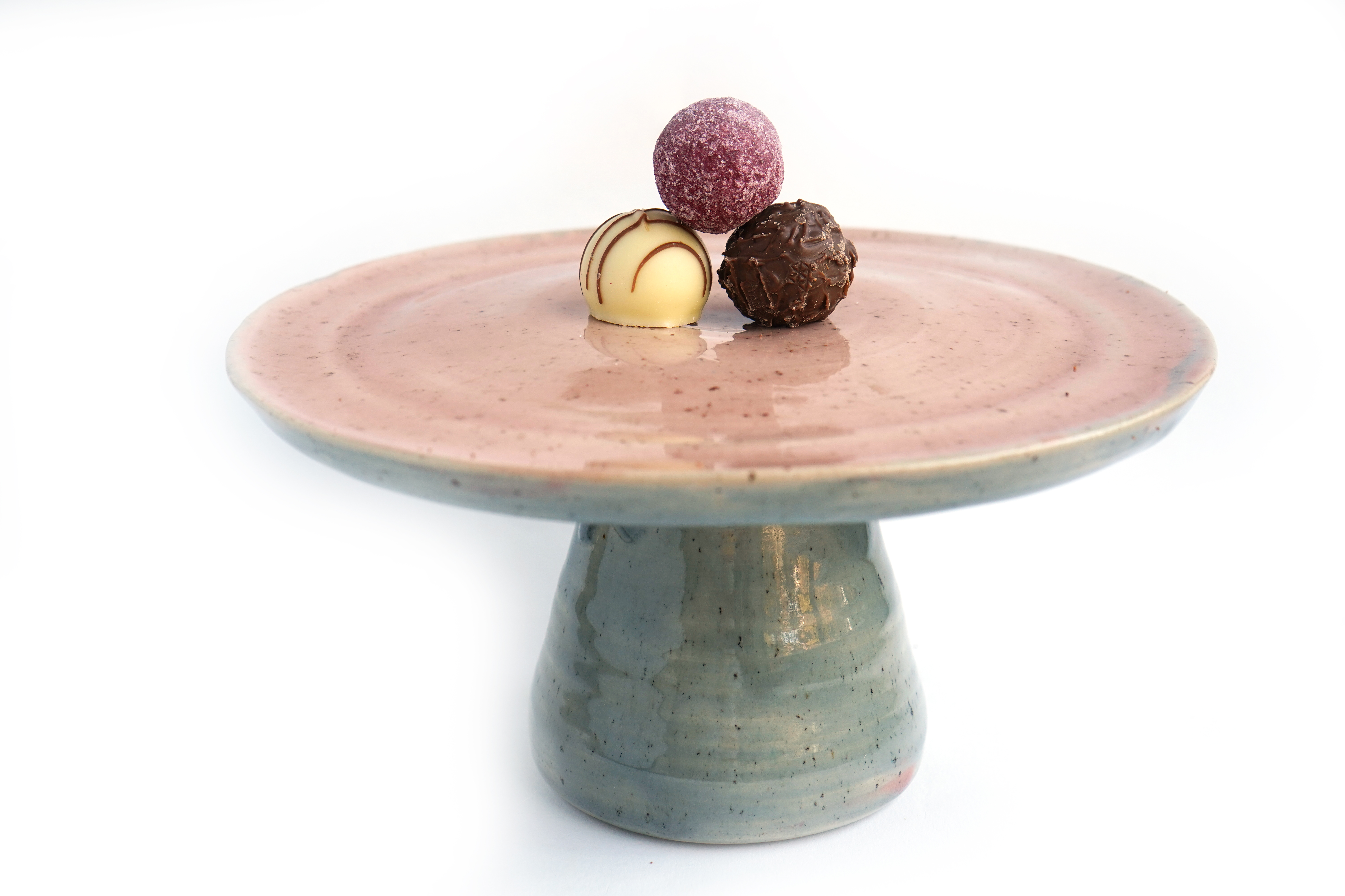 Der Cake Ständer ist handgedreht auf der Drehscheibe und mit hochwertigen lebensmittelechten Farben glasiert und im Hochbrand gebrannt.