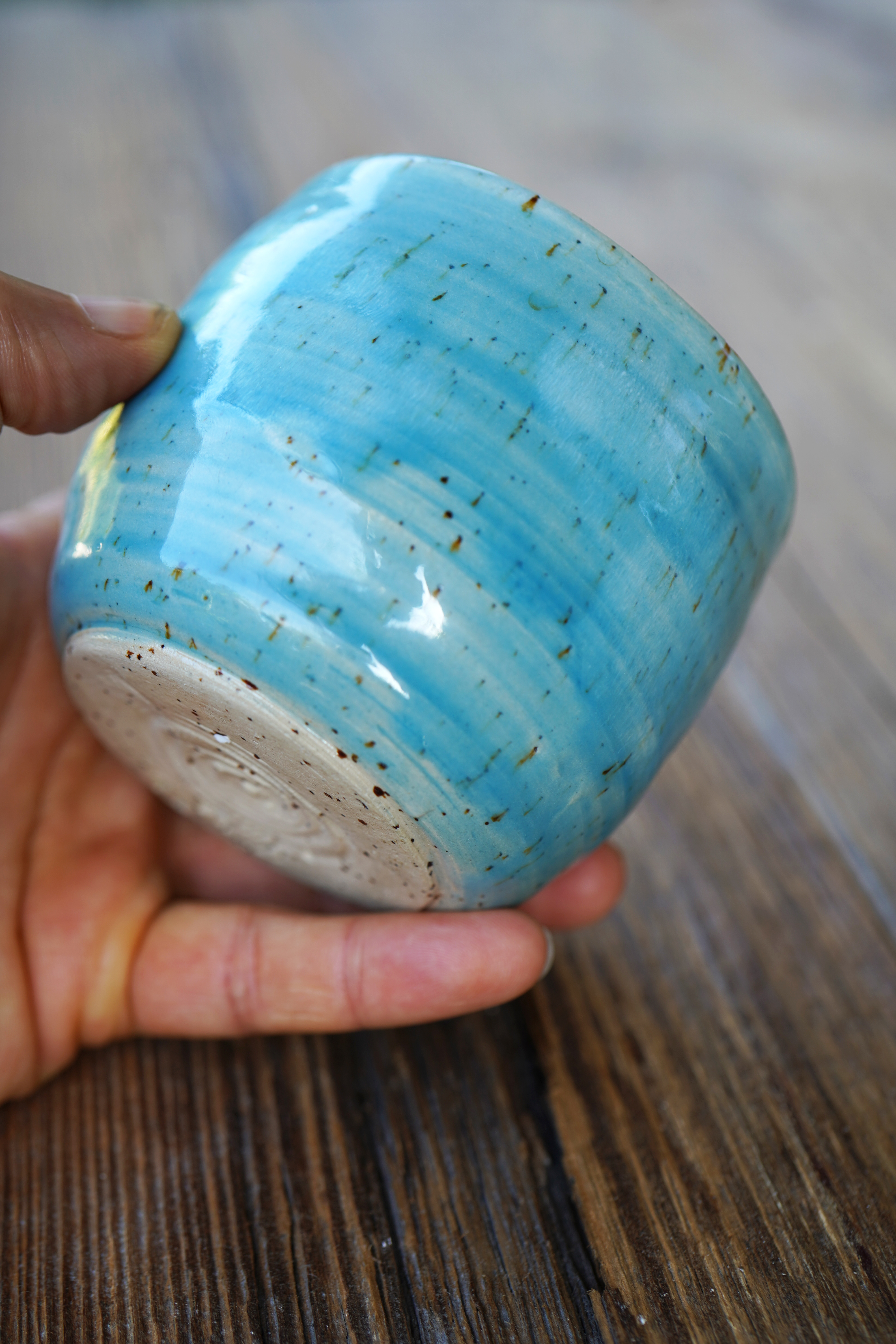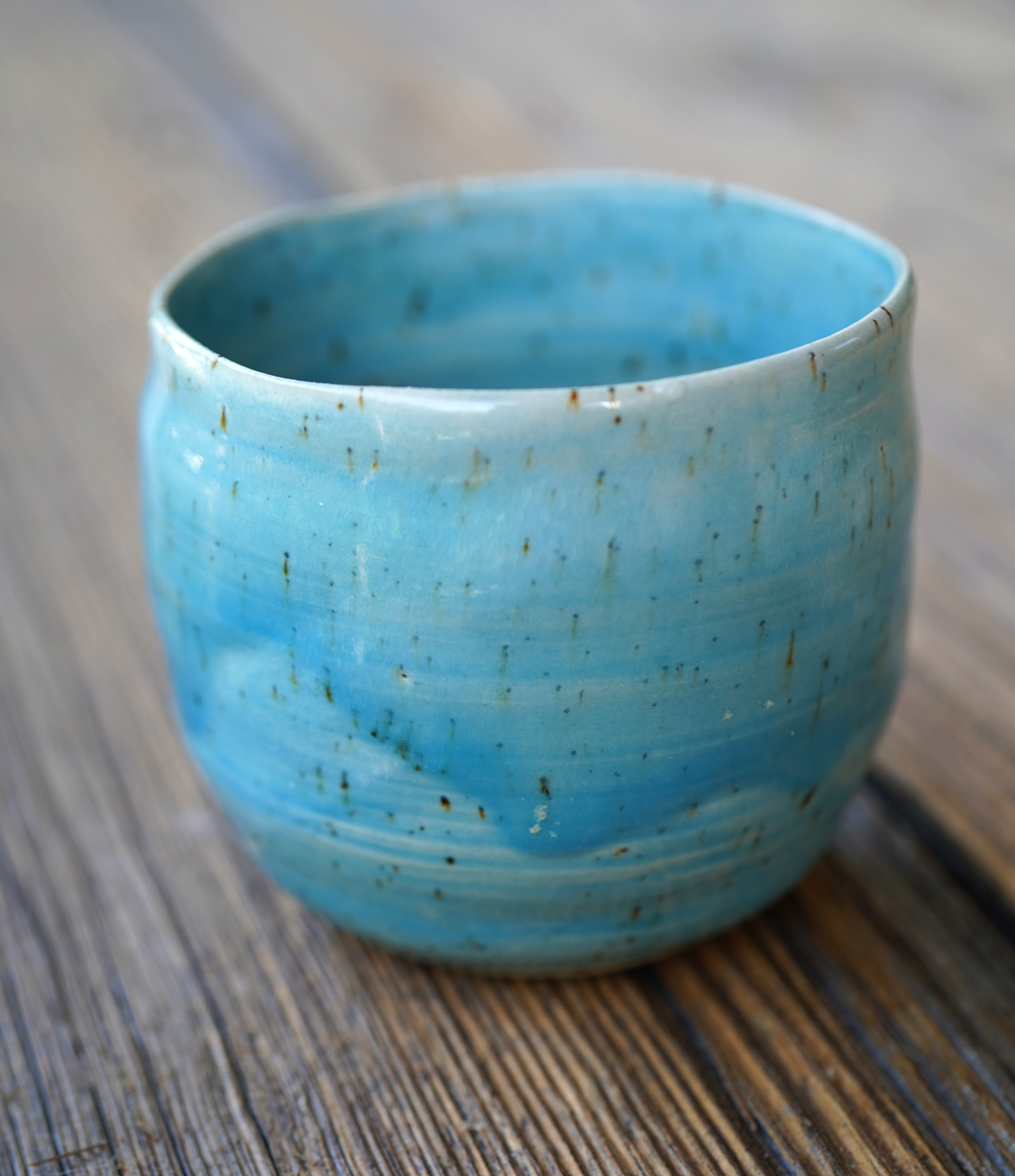Dieser wunderschöne handgetöpferte Kaffeebecher in schönem türkis hat eine frische und lebendige Glasur, die die organische Form und die handwerkliche Verarbeitung unterstreicht. Der Becher liegt sehr gut in der Hand. Er eignet sich für einen Cappuccino oder auch einen ganz normalen Kaffee. Jeder Becher ist ein Unikat und vereint moderne Ästhetik mit traditioneller Handwerkskunst. Die natürliche Struktur und die feinen Details machen diesen Becher zu einem idealen Begleiter für Kaffeeliebhaber, die Wert auf Individualität und Stil legen