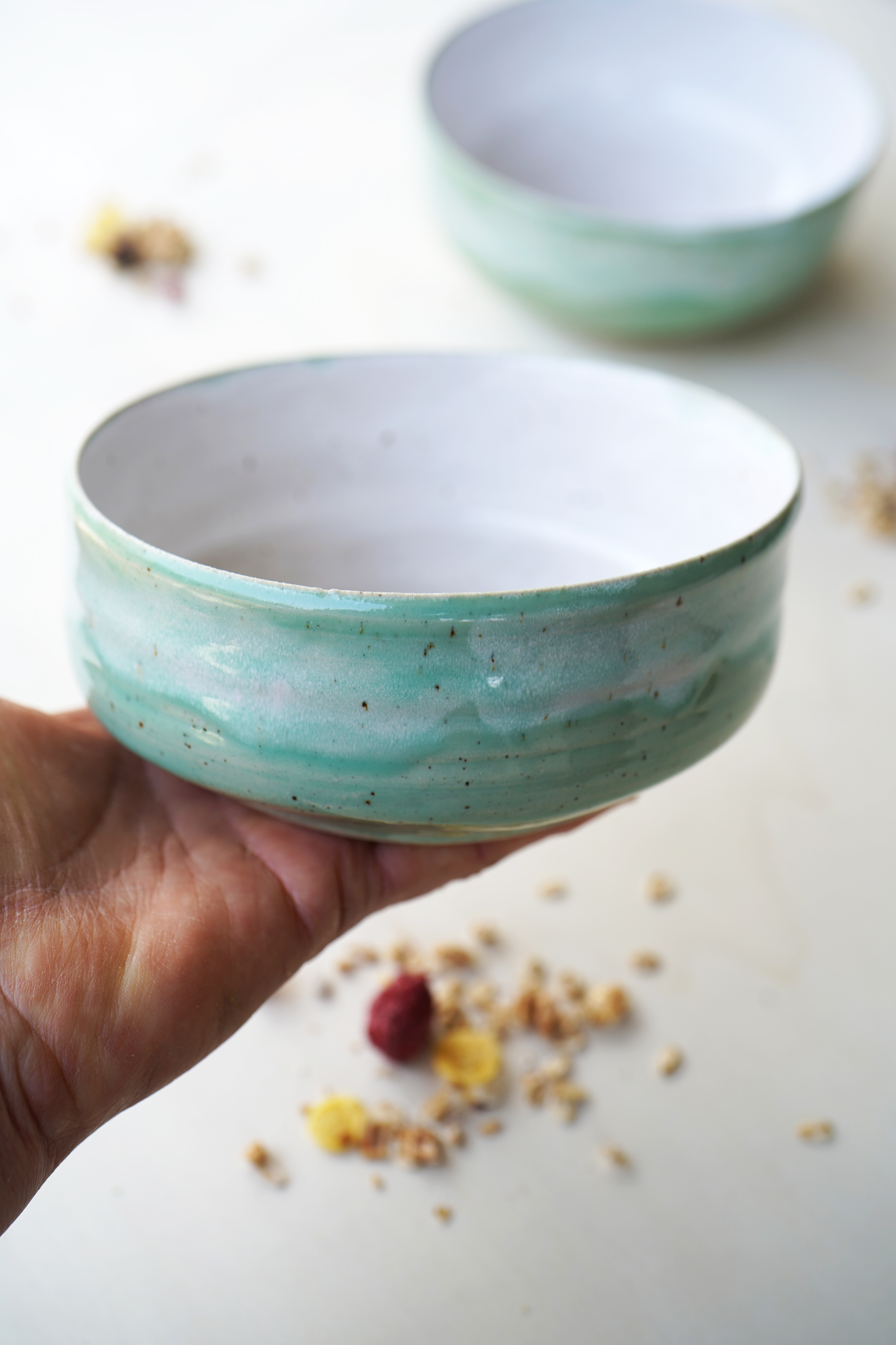 handgetöpferte Bowl Keramik Schale für Frühstücks Müsli, Quark, etc.. in modernem Aquamarin blau oder Pastellgrün spülmaschinenfest