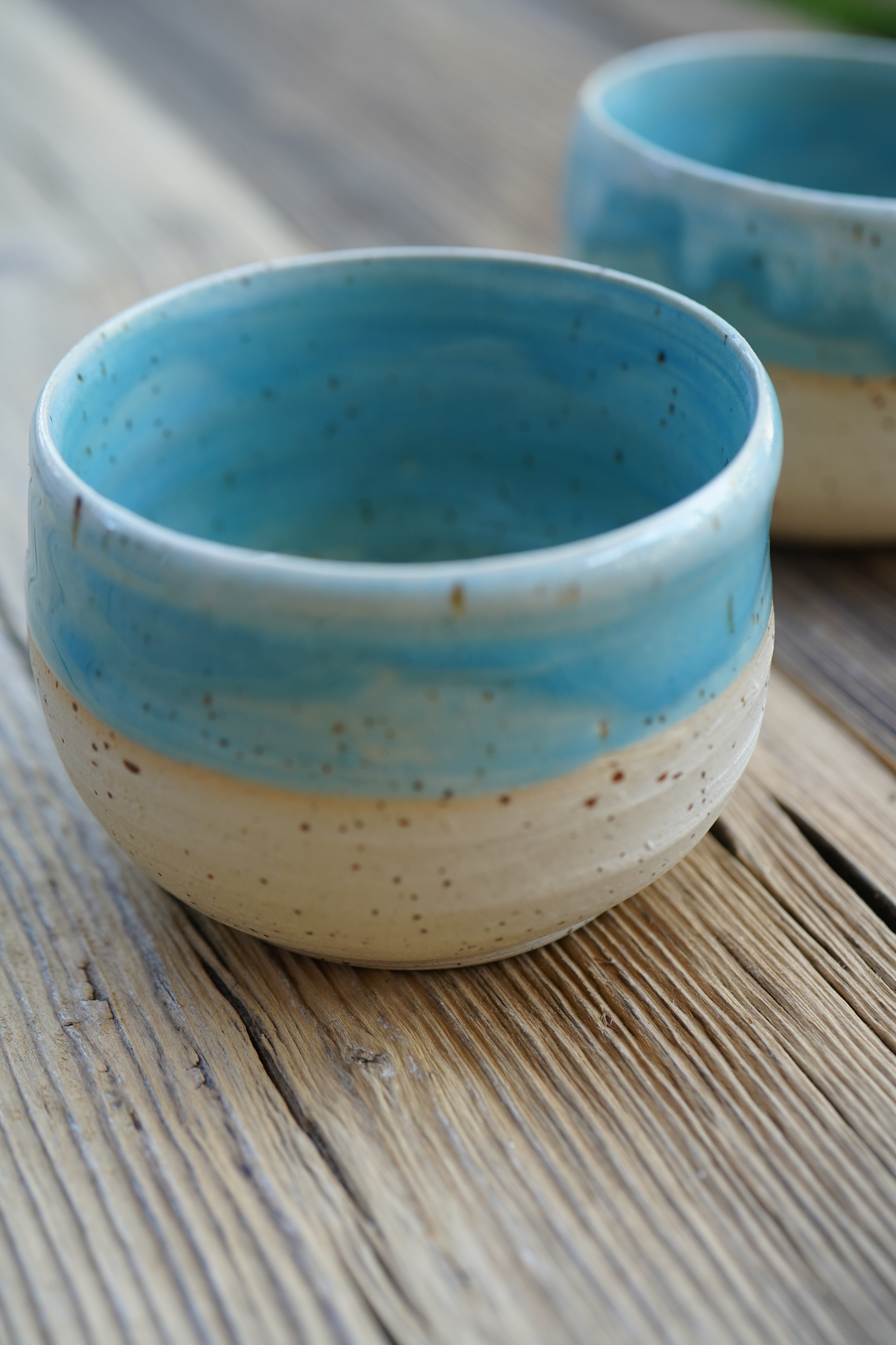 handgetöpferter hellblau creme Keramik Mocca Kaffee Becher, Durchmesser 8 cm Höhe 6 cm